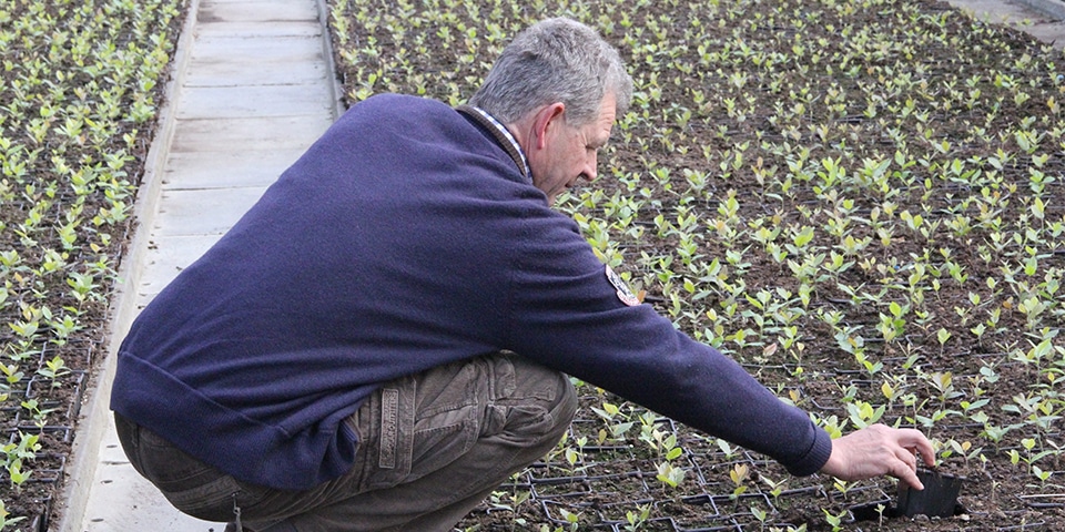 Hugo Maes controleert enkele jonge stekjes die worden opgekweekt.